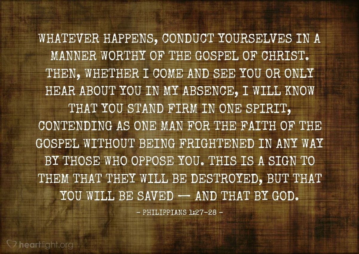Whatever happens, conduct yourselves in a manner worthy of the gospel of Christ. Then, whether I come and see you or only hear about you in my absence, I will know that you stand firm in one spirit, contending as one man for the faith of the gospel without being frightened in any way by those who oppose you. This is a sign to them that they will be destroyed, but that you will be saved — and that by God. — Philippians 1:27-2
